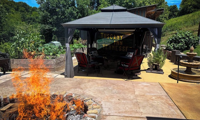 Situated adjacent to an Old World, Tuscan style renovated Tennessee barn. We offer a unique studio, set on a “piazza” with hot tub, fire pit and relaxing seating areas. It is surrounded by amazing views reminiscent of the Tuscan countryside, featuring vineyards and sheep. Next to the Piazza is The Trattoria, our in-house bistro featuring homemade dishes crafted by Chef Esther. Enjoy a full breakfast (including our traditional English Breakfast), or a quick bite, before enjoying a hike on our 33 acres, or visiting any of the amazing waterfalls and scenery surrounding the area. Finish the day with a delightful dinner and a movie around the fire.