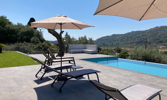 The sleek lines and minimalist aesthetics of the villa create an atmosphere of modern elegance, while expansive windows allow natural light to illuminate the interiors, offering breathtaking views of the surrounding landscape. The private pool invites relaxation, providing a refreshing retreat under the Mediterranean sun.