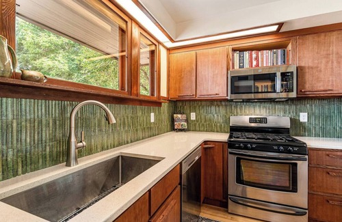 Schambra House is a renovated 1935 home in a well-established family-friendly neighborhood. Designed by Lewis Stevens who studied under America's most significant architect, Frank Lloyd Wright. In 1934, Wright passed his craft onto Lewis Everett Stevens at the Taliesin Fellowship. In the year following the training, Mr. Stevens created this house for the Schambra family. Stevens left us an architectural gift, and we have renovated it to share with you. Welcome, to Schambra House. Superb architecture has a way of communicating with you at an emotional level as you move from room to room. You will find Schambra House to be a space inviting you to experience your emotional journey. Midland is a town filled with many Mid-Century Modern delights. Many were created by Alden B. Dow, a cohort of Lewis Stevens at the Taliesin Fellowship. To our knowledge, Schambra House is the only Midland property, inspired by Wright’s apprenticeship, available for short-term stays. Now, truly experience a home the way that Wright and all his apprentices intended you to; live in it for a time. We invite you to make Schambra House, Your House. The house is within a 10-minute drive of most of Midland’s activities including the Dow Diamond (Great Lakes Loons Baseball). It is a mere 0.3-mile walk from Dow Gardens, The Canopy Walk, and the Midland Center for the Arts. It is close to the Dow Headquarters and MyMichigan Hospital if you are in town for work. You are only 15 minutes from MBS Airport and within a 20-mile radius of Central Michigan University, Northwood University, and Saginaw Valley State University. Soaring Eagle Casino is a short 30-minute drive away. Functionally experience art and nature, through the house designed by a talented architect. The private spaces in this house have been designed to help you unwind. Two bedrooms have queen-size beds and a shared bathroom. One of these rooms also has a desk and chair. The lower bedroom has a king-size bed with a bathroom adjacent to its door. The two bathrooms are stocked with basic amenities. There is a dedicated office space large enough for two people with inviting windows to the backyard and two monitors. There is high-speed internet throughout the house. Also, check out the unique Kid Nook for the younger at heart. Bring family and friends to enjoy indoor and outdoor games together. The rec room includes a Crokinole board and dart board that will help you reconnect with family and friends and perhaps go home with bragging rights. Enjoy corn-hole, Giant Connect Four, Tipsy Toss game, and more for outdoor fun with games accessible from the back of the garage (the front is reserved for owner storage). A cruiser bike is also available for your use during your stay. Or you may choose to simply relax in the enclosed backyard by sitting on the deck beside the tranquil koi pond watching our family fish. Names of the fish are provided to guests so you can get to know them better. 😊 Schambra House is situated toward the end of a quiet cul-de-sac steps away from a small neighborhood park. It is an intimate neighborhood, but the home’s architecture creates a private experience. A kitchen with custom-built cabinets and shelving appropriate to the home’s architectural period will invite you to cook a quick meal or family sit-down dinner. Enjoy a meal at the dining room table that seats eight comfortably or at the outdoor dining space on the patio. There is a pantry, full-size appliances, and all the accessories needed. Enjoy coffee at the personally crafted bar made from black walnut wood milled from the owner’s family homestead. Please note that Schambra House has several levels to explore with many stairs. Although sturdy handrails (also handmade from the family’s black walnut wood) are provided, some people with limited mobility may have difficulty accessing all levels of this historic home. Experience a home built in 1935 for the needs of the Schambra family but restored and reimagined for yours in 2024. Keyless entry, you will be sent the code via the Airbnb app from Yale shortly after the reservation is confirmed. Guests have access to the whole house, all four levels, patio, yard, and the back of the garage. The washer and dryer are in the lowest level. Guests do not have access to a small owner area near the lower level nor the front of the garage. All parking is outside in a driveway that will accommodate 3-4 vehicles. We live in Midland and would love to meet you if you desire. The check-in process is keyless so you can come and go as you prefer. If you need something, however, we are just a message away. Schambra House is a family-friendly travel experience. We are a non-smoking and pet-free property, with 10 PM outdoor quiet hours (respectable voice levels are acceptable). The house is fully stocked with towels and bedding/pillows all of which have been laundered especially for each guest down to the mattress and pillow protectors and each layer of bedding. You won't need to worry about cuddling up under the blankets and comforters here. They are fresh each time just for you. We provide 2 toilet paper rolls for each bathroom (please use that provided as our sewer system is historic just like the house) and 1 paper towel roll. Shampoo, conditioner, body wash, dish soap, hand soap, laundry detergent, and dishwasher pods are provided. The kitchen has pots, pans, dishes, a microwave, toaster, blender, wine opener, and three ways to make coffee along with a hot water kettle for tea. We provide locally roasted coffee and tea. There are 42" televisions in each bedroom, and 55" televisions in the living room and rec room, each with Roku. PLEASE BRING your logins for your streaming services. Rokus are set up for “guest mode” so you can log in and be automatically logged out at noon on the day of your departure. ROKU has some free options for your watching pleasure if you do not have streaming subscriptions. No local TV service is provided. Pleas