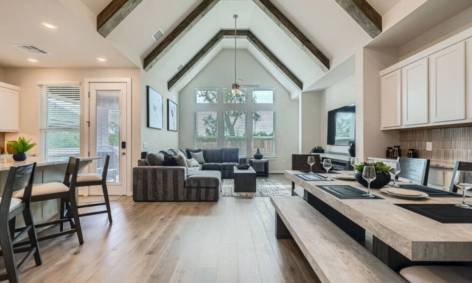 Living Room: Unwind in the grand living and dining area, boasting vaulted ceilings and a plush sectional (with a pull-out sofa bed) facing a 75" Smart TV – perfect for cozy movie nights.