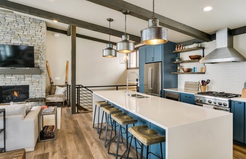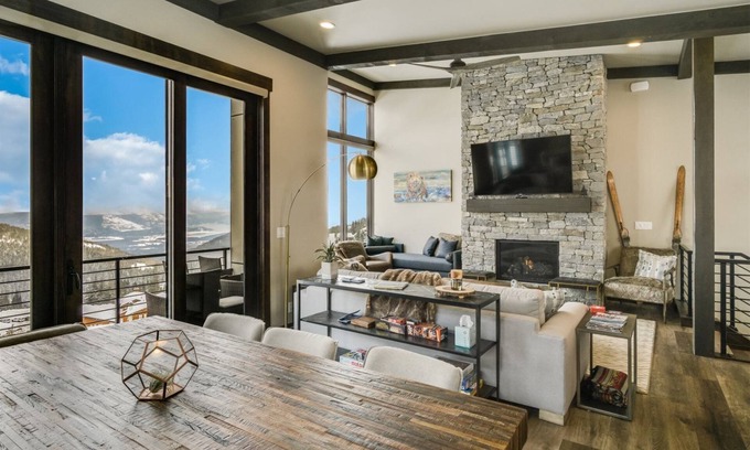 This luxurious townhome boasts an array of amenities tailored for comfort and enjoyment. You will find a spacious Great Room with soaring windows that provide panoramic vistas, ensuring that every moment spent here is captivating. The gourmet kitchen features commercial-grade appliances, perfect for preparing celebratory meals, while the elegant dining area accommodates guests effortlessly. Each of the three beautifully appointed stories includes a master suite with a King bed and additional guest bedrooms with Queen beds, ensuring ample space for relaxation. Unwind after festivities in the large hot tub or rejuvenate in the yoga room — this property has all the touches to make your stay both luxurious and comfortable.