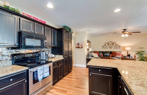 Great times include great meals. If you're dining in the kitchen is where it all begins. A large eat at counter for 3 is also ideal for food prep, serving meals or tending bar. We've included all of the essentials; Refrigerator and ice maker, electric stove and microwave, Keurig coffee maker and drip coffee maker, blender, hand mixer, food chopper are all available for your use. Open the cabinets for cookware, glasses dishware, eating utensils and every gadget you will need ! We do provide all paper products, spices, condiments etc. When it's time to clean up there is a dishwasher to make life easier. The kitchen is eat-in for 4 and for family style dining there is a table for 6 on the back patio pool-side and also a table for 6 in the dining room. If you choose to dine out we have provided a restaurant guide with all of the local hot spots by food category for you to pick from.