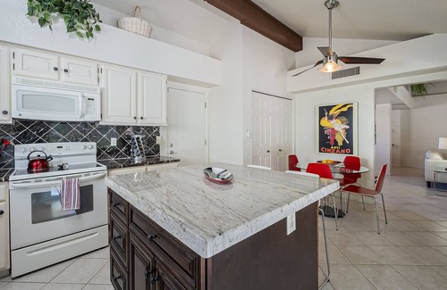 The house is close to everything yet quiet!! Super convenient. Just 3 miles from the Talking Stick Casino and the Colorado Rockies/Arizona Diamondbacks Spring Training baseball stadium. This home is 2 miles southeast of the TPC Golf for the Waste Management Open and West World for the Barrett-Jackson Car show and numerous horse shows. The McDowell Mountain Preserve (84 miles of trails) has trailheads just two miles from our location. This is IT!! Your own Private Oasis, Backyard Pool, Covered Patio, home with soaring ceilings, open living/dining area. Leather couches and mid-century modern decor. Contemporary one level home 2 bedrooms, Plus a fully equipped office (printer, copier) with 2 baths. Granite Countertops, 1 Car attached garage, fireplace. Includes 2 flat screen TV's, outdoor patio furniture, BBQ, all linens and fully stocked kitchen. Cable TV, WIFI, lawn and pool service. Just Bring Your Toothbrush! Please contact the owner for details for length of your stay.