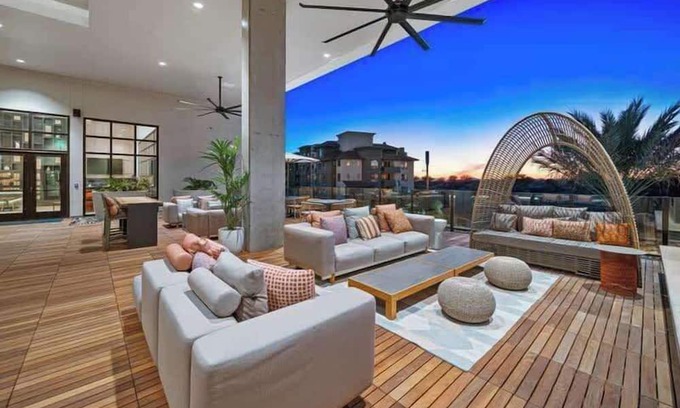 Welcome to The Scottsdale-Kierland Escape, your spacious and sunlit retreat. The open layout invites an abundance of natural light, creating a warm and inviting atmosphere. Whether you're here to work or unwind, we've got you covered with high-speed WiFi in the dedicated workspace, a fully equipped kitchen, a wine cooler, and a cozy sofa with mountain views to unwind and enjoy your favorite TV shows. For added relaxation, there's a gym, sauna, hot-tub spa & cold plunge & garage parking.