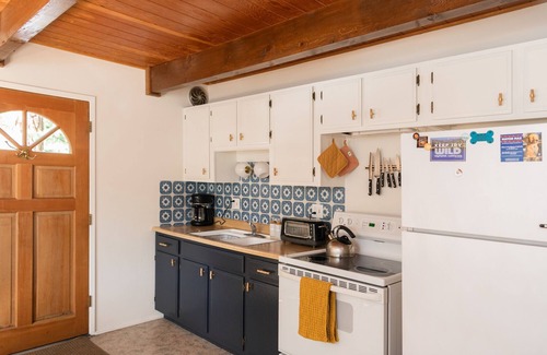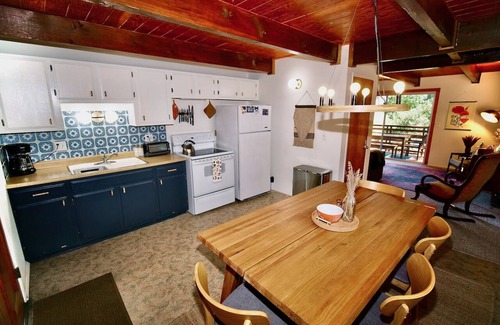 Scout's Hideaway is nestled at the end of a quiet road, surrounded by tall pine trees. With a forested backyard and a deck perfect for sipping coffee, you can enjoy sightings of deer, bluebirds, woodpeckers, squirrels, chipmunks, rabbits, and lizards. Despite the peaceful seclusion, Idyllwild’s town center and hiking trails are just a 6-minute drive away. This modern but vintage cabin features two spacious bedrooms—one with a king bed and the other with a queen. The cozy living room opens onto the deck, creating a seamless indoor-outdoor space. The fully equipped kitchen comes with coffee and tea to start your day. In the evening, light a fire in the wood-burning stove, unwind with a glass of whiskey or wine, and enjoy the sunset from the deck. Designed as a tranquil retreat, Scout's Hideaway offers games and puzzles for entertainment, but no TV. Feel free to bring your own device or ask us for our projector for streaming. While WiFi is available, this is the perfect spot to disconnect and enjoy the natural beauty surrounding you.
