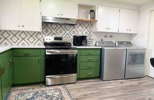 -Major appliances: electric stove, microwave, refrigerator with filtered water and automatic ice dispenser, garbage disposal, full size washer and dryer (dryer sheets and All Free and Clear pods provided)