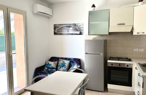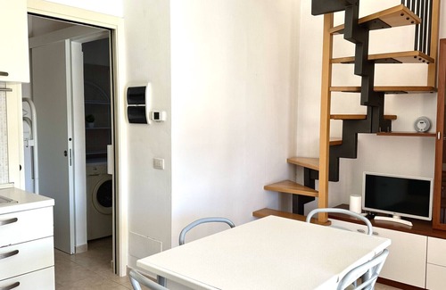 Description: three-room apartment on the ground floor on two levels with private external courtyard. Entrance to living room with sofa, dining table and kitchenette - bedroom with bunk bed - bathroom with shower cubicle and washing machine. Upstairs master bedroom with double bed and en suite bathroom with shower.