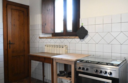 Description: portion of a farmhouse on two levels. Ground floor with living room with sofas and fireplace – dining area with table and chairs – kitchen complete with fridge, oven and dishwasher – service bathroom with washing machine. First floor with double bedroom – second bedroom with double bed and single bed – third bedroom with single bed – complete bathroom with tub. Washing machine – garden - parking space - pets allowed.