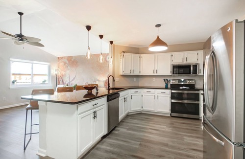This two bedrrom, 1.5 bathroom house, features a full kitchen with granite counters, filtered water, keurig coffee machine, range with double oven and built-in air fryer, ninja blender, and more. The beautiful sun room with double swing egg-chair looks out on a private fenced yard. For your comfort the memory foam beds have both down pillows and cooling gel pillows.