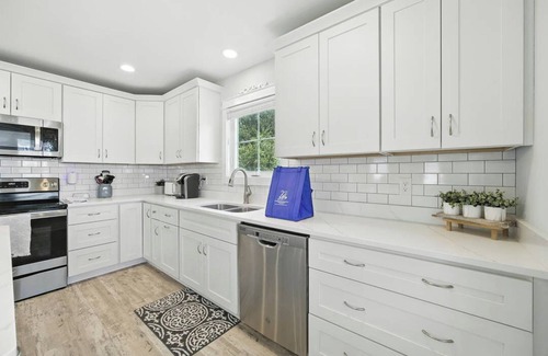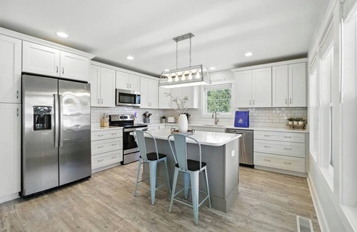 Mid-Level: Living Room with TV; Dining Room with Table (seats 8); Kitchen with Bar (seats 2), Blender, Coffee Maker (Drip & Keurig), Dishwasher, Microwave, Oven/Stove, Refrigerator, Toaster, Pots, Pans, Dishes, and Cooking Essentials; King Master Bedroom with TV and Attached Full Bathroom with 2 Sink Vanity and Tile Shower; King Bedroom with TV; Hall Full Bathroom; Laundry Room.