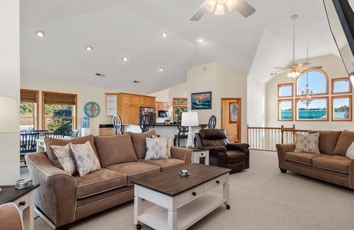 Your stay at Sea-Sound Blessing includes a variety of luxurious amenities designed to elevate your experience. The property boasts a private heated pool overlooking a serene lake, ideal for post-ceremony relaxation or pre-wedding festivities. Unwind in the hot tub, swing in the hammock, or gather in the expansive great room that features panoramic windows showcasing spectacular sunset vistas. Additionally, the chef-inspired kitchen is equipped with granite countertops, stainless steel appliances, and double ovens—perfect for catering your wedding events or enjoying meals with loved ones. Each of the four master suites provides privacy and comfort, ensuring restful nights after celebrating your special day.