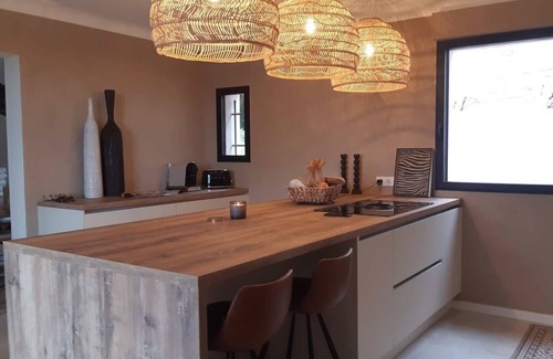 In a secure property of 1500m2, the house of 180m2 on 2 levels offers its guests, in a cozy & contemporary layout, with modern Provencal tones, and very nice amenities, 3 beautiful bedrooms en suite:
