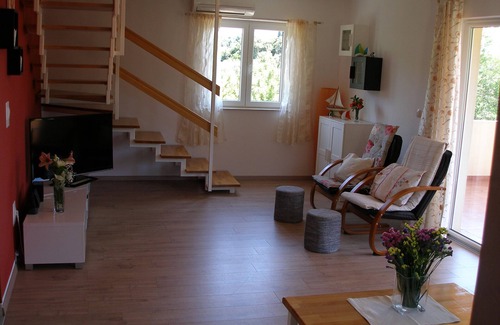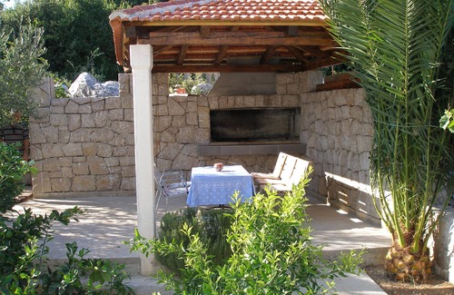House offers completely equipped modern kitchen with dining area, big covered terrace with wonderful sea view, one double bed bedroom, one bedroom with 2 standard size beds, big specious living room. There are two bathrooms and storage room. Free wi-fi is available in the whole house and garden. In the garden you can use covered outside terrace with fireplace and part for sunbathing. Owners grow their own seasonal vegetables which are on your disposal also.