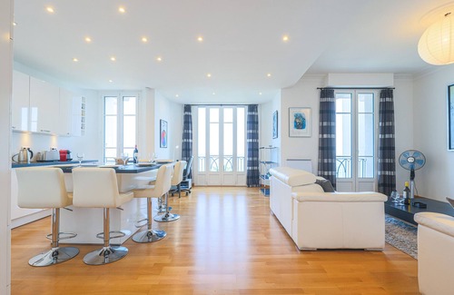 A charming apartment located on the famous Promenade des Anglais in a beautiful building, fully equipped and very cozy for a pleasant stay by the sea on the Promenade des Anglais, with direct access to the beach.SpaceWelcome to our apartment in front of the sea, Located on the 5th floor with elevator, you will find all the comforts: proximity to touristic places, space, AC, equipped kitchen, washing machine, dishwasher, oven, Wi-Fi... This apartment consists in two comfortable bedroom, two bathrooms with shower, open kitchen on the living room with TV and sea view.Kitchen is fully equipped: fridge, hotplates, oven, dishwasher, coffee machine and kettle. AccessThe apartment is fully equipped. Bed linens and bathroom towels are provided, and you will have access to the complete accommodation.The apartment is not accessible to people with reduced mobility.InteractionBnb Groom Services’ team is glad to greet you in Nice. A member of our team will greet you on site to give you the keys. We will be there to advise you before and during your stay, available by phone or by email to answer any questions and make sure you spend a great stay at your home away from home.NeighborhoodThe apartment is close to the beach and the Promenade des Anglais, Nice International Airport and the Tramway line (Sainte-Hélène stop) to reach the city center in a few minutes.Walk accross the street and you will arrive on the beach. You will also find many shops in the immediate neighborhood. (bakery, supermarket, banks, restaurants etc) Take the tram for 20 minutes and you will arrive in the Old Town, the historic and lively area of Nice. TransitAccess to accommodation from the airport is possible by tram: take the line n°2 in direction of Port Lympia and stop at Sainte-Hélène. Journey takes only 20 minutes and this stop is 200m away from the apartment. You can also ask us to arrange a private car transfer from the airport to the apartment.Train station « Nice Saint Augustin » is 2km away, allowing you to discover Antibes, Cannes, Grasse, Monaco, Menton or even to go in Italy easily.You can come in Nice by car and park in the streets around or in one of the public parking of the city. Closest one is Parking Les Bosquets, only 450m away from the apartment.IMPORTANT - RULES OF PROCEDURE :For security reasons, before arrival an online check-in should be completed via our Yaago application in which the person in charge of the booking should provide identity document.The accommodation should be returned in a suitable state of use, respecting the premises, the neighborhood, as well as basic rules of cleanliness and hygiene.Parties and noisy evening gatherings are not allowed.Smoking isn’t allowed inside.Non-compliance with these instructions may result in a deduction from the deposit or cancellation of the stay.Thanking you in advance for your kind collaboration.