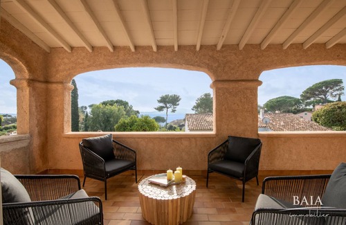 In the Commune of GRIMAUD, on the edge of SAINTE-MAXIME, facing the bay of the Gulf of SAINT-TROPEZ, this villa in the Domaine des Cigales offers you all the services to spend unforgettable holidays with family or friends, with a very beautiful sea view with trees.