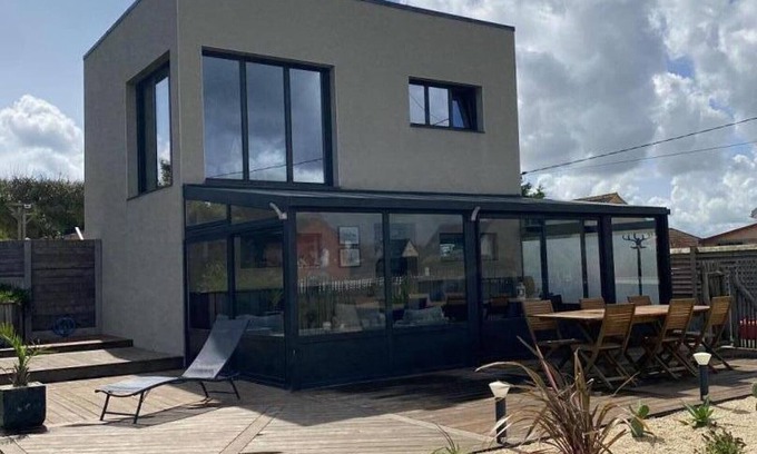 Detached house. Veranda with relaxation area. Living room (TV, internet access) with equipped kitchen area (oven, dishwasher, freezer, microwave). Shower room with toilet (washing machine-dryer combination). Upstairs, mezzanine lounge with sea view (convertible for 2 people). Bedroom 1 (1 bed 160X200). Bedroom 2 (2 beds 90x200). toilet. Baby equipment. Sheets and towels for hire. Electric heating included. Cleaning service at an additional cost. Private enclosed grounds. Wooden terrace. Garden furniture. Barbecue. Shelter. Parking. Direct access to the beach. This contemporary villa stands proudly in the sand dunes and faces the deep blue. The fully glazed upstairs lounge offers a superb panorama of the tip of St Vaast la Hougue to the St Marcouf islands and makes this cottage unique! The owners have applied themselves to the interior design for your well-being and have paid particular attention to the decoration. The house also has a large plot surrounded by ganivelles. You will appreciate this very privileged location, especially from the large terrace or the veranda. With the tides you can reach the large sandy beach at the end of your garden! A real corner of paradise for your family between St Vaast la Hougue and the famous Utah Beach.