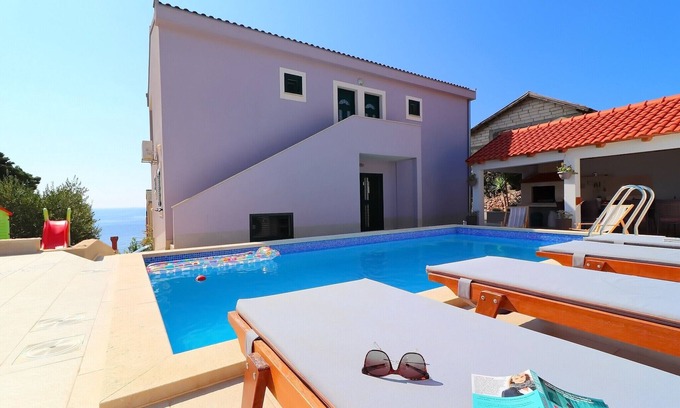 Located in the peaceful village of Čara, this spacious 5-bedroom holiday home offers stunning sea views and is ideal for two families or a group of 10 friends. Take a dip in the private heated pool, enjoy your meals on the veranda with a sea-facing dining area, or relax with a good book in the garden. Just 200 m from the beach, you can enjoy morning walks by the sea or lazy afternoons soaking up the sun. The town center is 500 m away, offering shops and restaurants to explore. For those looking to venture further, public transport is 2 km from the home. Inside, you'll find a fully equipped kitchen, air conditioning, and a balcony on the first floor with more panoramic views. The property includes a garage, and in the evenings, the outdoor fireplace is perfect for gathering with friends. Whether you're dining outdoors, swimming, or simply relaxing, this home promises a memorable coastal escape.