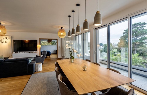 Sea-view villa with 4x10 heated and covered pool is located in Carantec. Sea-view villa with 4x10 heated and covered pool provides accommodation, featuring Kitchen, TV, Balcony/Terrace, among other amenities. This Villa features Kitchen, TV, Balcony/Terrace, to make your stay a comfortable one.