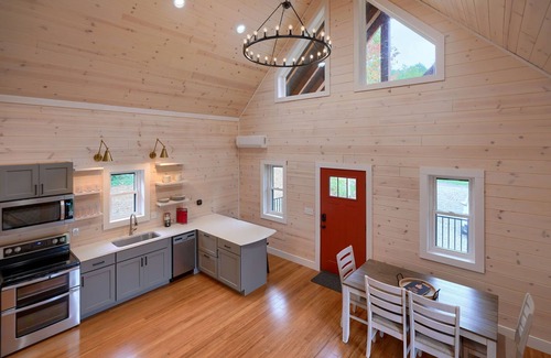 The cabin offers two private bedrooms and one open loft room, all with queen beds and secluded views. There are two full bathrooms, one with a shower only and the other with a tub/shower combo.