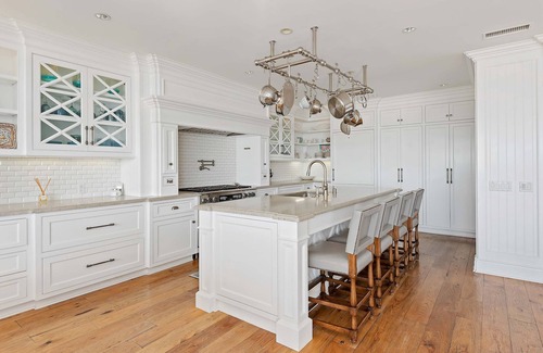 Back downstairs, the sparkling kitchen showcases stainless steel appliances, smooth stone countertops, and sleek white cabinetry stocked with cookware and dining ware. Snag a high-top stool at the island to assist in meal preparation or snack on a spread of afternoon hors d’oeuvres, while a formal dining table keeps those incredible views front and center as you gather the whole crew for formal dining and family game nights alike.