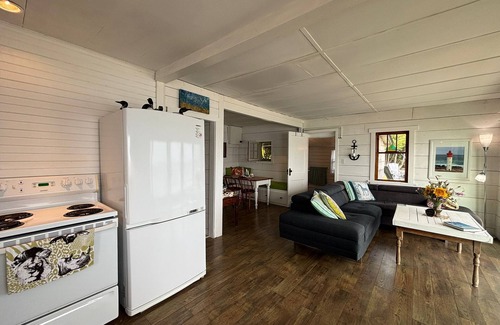 Inside, Seafari offers an open-concept living, dining, and kitchen space with a built-in bench and large windows that frame the sparkling water. The main cottage features one comfortable bedroom and a three-piece bathroom—perfect for a peaceful retreat for one or two guests.