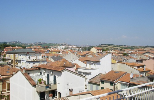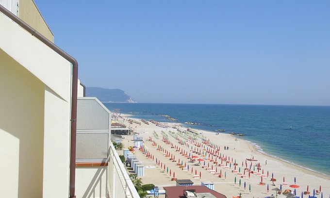 Comfortable and large seafront apartment at the 5th floor with elevator in the center of Porto Recanati. Wonderful view of the hills from the back. Two bedrooms (one double bed and one twin bed), one large living room with a comfortable double sofa bed, one well equipped kitchen (refrigerator, freezer, microwave, washing machine, etc.), one bathroom.