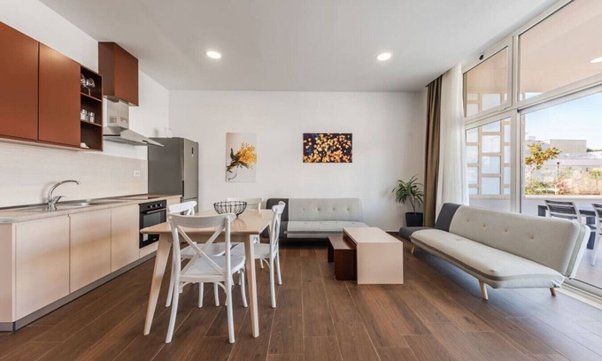 Escape to Mimoza, a stylish 1-bedroom, 1-bathroom apartment at Perla Resort in the serene Gjiri i Lalëzit. Perfect for families or friends, this modern retreat features a spacious balcony with stunning garden views. Wake up to the gentle sound of waves and enjoy the seafront location just steps away from the beach. With cozy interiors and a peaceful ambiance, Mimoza offers the ideal blend of comfort and luxury for your coastal getaway. Book your stay today!