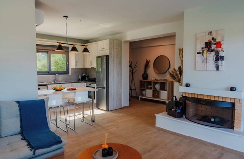 Step into the open-plan space, featuring a cozy lounge area with an indoor fireplace for chilly days, a well-appointed dining area, a fully equipped kitchen, three bedrooms, and two bathrooms. The first bedroom is located on the ground floor, while the other two bedrooms are on the first floor, each featuring a double bed. All bedrooms provide direct access to the veranda, offering stunning views of Navarino. Every amenity necessary for a comfortable vacation has been thoughtfully provided, ensuring a delightful stay. Additionally, all rooms are air-conditioned.