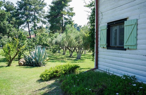 When this luxurious wooden villa was built, it was inspired by the architectural style of Switzerland’s mountains. It's located right next to Pefkochori village, at a quiet residential neighborhood. The house boasts direct access to a fantastic beach and has also a garden which is filled with a lot of different tree species.