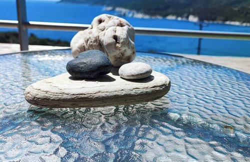 Seagulls has a 100sqm space divided in two floors. On the ground floor there is a fully equipped open plan kitchen where you can prepare all your meals. In the living room the indoors dining table will comfortably seat more than 6 guests and the big sofa with the stone fireplace and the unblocked view to the sea through the glass doors create a perfect atmosphere for relaxation. A 32’ inch TV, free Wi-Fi internet access, NETFLIX and a Stereo Receiver are there to entertain our guests. A guest WC is also located on this level. The balcony on the ground floor has an outdoor table and a built-in sofa for relaxing, drinking and eating during the summer days and evenings. A couple of stairs from the balcony can lead you directly to the lower stone yard without the need to re-enter the house and use the main door. Stairs from the ground level lead to the upper floor of the property where you can find two bedrooms and the main bathroom of the house. All bedrooms have their own spacious wardrobe and share a large balcony with a stunning and unblocked view to the Aegean Sea.