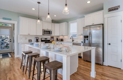 Enjoy the amenities of Olivia Beach from this pretty Cape Cod-style home right across the street from the neighborhood’s park, playground, fire pit and volleyball court. It’s a short walk through picturesque homes to access the beach where you can walk for miles on level sand and search for sea creatures at low tide on the off-shore rocks. You’ll also have in-season access to a pool and year-round access to an exercise room. Searenity Now has a gorgeous great room, with hardwood floors, high ceilings and a beautiful sitting area with TV and a gas fireplace. The sleek, fully equipped kitchen has stainless steel appliances, a large island with a granite top and pendant lighting, plus a pretty dining space nearby. Upstairs, you’ll find three bedrooms, including a spacious king suite and a kids’ room with an adorable built-in bunk bed. A deck out back holds a bubbling hot tub, a barbecue adjoins the back patio, and Adirondack chairs perch on the front deck so you can keep track of the kids at the park. It’s a marvelous walk through the neighborhood to the Nelscott District, where you can find coffee, dining, chocolate, books and shopping—there’s even Theatre West, a local playhouse, for entertainment. Find your own “searenity” when you combine beach-time with relaxation at this wonderful neighborhood home.