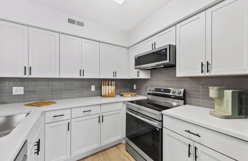 The living area is tastefully furnished with comfort in mind, creating the perfect space to relax and enjoy entertainment on the brand-new smart TVs, available throughout the home. The fully appointed kitchen is a chef’s dream, featuring stunning quartz countertops, a sleek breakfast bar, and brand-new stainless steel appliances. High-end cookware is provided for those nights when you feel like staying in and preparing a delicious meal.