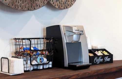 The loft features one bedroom with a comfortable King bed, providing a cozy retreat for a restful night's sleep. The bathroom is equipped with a shower, and for your convenience, there's a kitchenette with a fridge, microwave, and stove top - perfect for preparing simple meals. A full Keurig coffee bar awaits to satisfy your coffee cravings throughout your stay, and a washer/dryer is available for your laundry needs.
