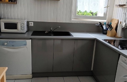 - 1 cuisine aménagée et équipée avec plaques vitrocéramiques 4 feux, 1 four électrique, 1 réfrigérateur, congélateur, 1 micro-onde, 1 lave-vaisselle, 1 cafetière, 1 bouilloire