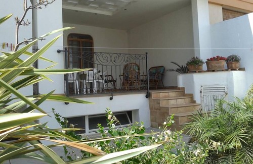 It is situated at 150 from the sea, close to the marvellous Salento's beach. This is a very pretty detached house with two levels, the ground floor is available for rent. In the front and back of the house are flowerbeds with a variety of different aromatic plants. In the back there is a large terrace with a fireplace that can be used for barbecues. In the front garden it is possible to park a car. The house is fully furnished and is very bright and airy. There is an equipped kitchen, a living room, 2 bedrooms (one with a double bed and the other with two single beds and a fifth bed is available in the living room) and a bathroom with an enclosed shower.