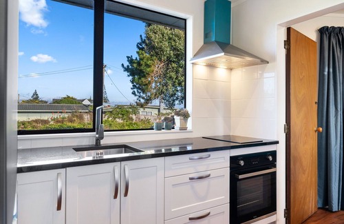 A fresh and inviting interior greets you inside, with full-length windows maximising natural sunlight in the stylish living space. Leather seating, a dining set, TV and heat pump comprise this comfortable space. Step through to a crisp, modern kitchen, which provides all the essentials to whip up a holiday meal.