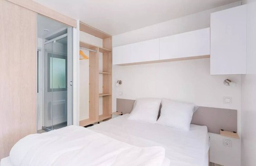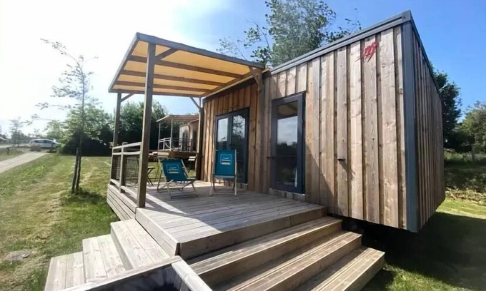 Accommodation: The 1 bedroom cottage has all the comfort necessary to welcome you during your stay at the campsite. It consists of a bedroom with a double bed and can accommodate up to 2 people. You will also find an equipped kitchen and a bathroom as well as a terrace to enjoy your holiday. Sheets included.