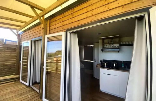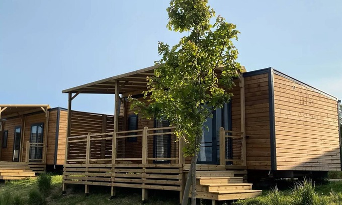 Accommodation: The 2-bedroom cottage has all the comfort necessary to welcome you during your stay at the campsite. It consists of 2 bedrooms (one with 1 double bed and one with 2 single beds) and can accommodate up to 4 people. There is also a fully equipped kitchen and a bathroom as well as a semi-covered terrace.Photos builders non contractual.