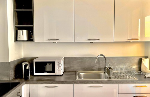 Ce superbe appartement est conçu comme la suite d'un hôtel, avec une chambre en alcôve intimiste ou ouverte pour plus d’espace avec la vue sur la Mediterrannée, une cuisine indépendante mais semi-ouverte très bien équipée avec accès sur la terrasse, un espace salle à manger, un salon confortable,une entrée avec placard et penderie,belle salle de bain moderne avec sa grande douche. Les toilettes sont petits,mais séparés!