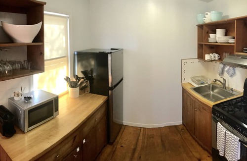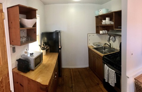 Inside, the decor is simple & classic. The whole cottage was refurnished with brand new organic modern furnishings in November of 2021. Wide plank hardwood floors throughout, with white wainscoting & a tranquil grey on the walls. The kitchen is fully stocked & you will find a washer and dryer hidden away in the living room closet. The bedroom has a queen gel memory foam bed & closet, with a dresser and desk with chair. The couch in the living room folds down to become a queen bed, so the house can sleep four guests. This is the perfect getaway for a couple, small family, or a group of friends to enjoy Montauk. There's also plenty of storage if you're spending the entire summer or for an extended winter stay.