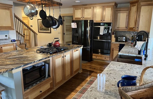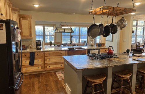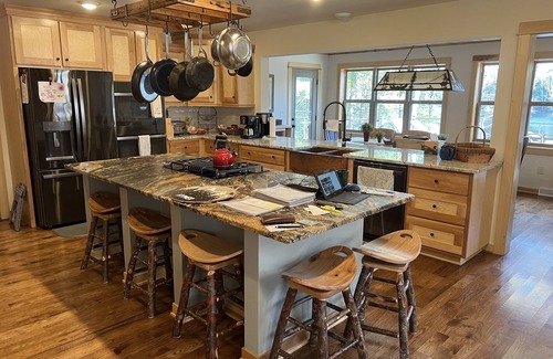 The spacious kitchen features custom-built cabinetry, with self-close sliding drawers and doors, a very large granite kitchen island, high-end appliances including a gas range with hand-built pot and pan rack above, double oven, large refrigerator with icemaker, a Cuisinart drip coffeemaker, microwave, Wolf blender and much more -- all the appliances and counter space needed to create memories in the kitchen to last a lifetime. The kitchen/dining area was designed with an open granite counter top that acts as a buffet style serving area for convenience and easy clean-up following a large meal together! Imagine taco or fajita night, a fish dinner with bass, crappies, and blue gills just caught and prepped within hours of catching them in your very own 25-acre private lake. The custom-made dining table can accommodate 10-12 or more, with added seating (5 stools) at the kitchen island. The close proximity of our dining allows everyone to feel included. But there’s more!! On the nicest of days, enjoy grilling and dining in our outdoor living area where you can be close to the water and cherish the openness of the lake property.