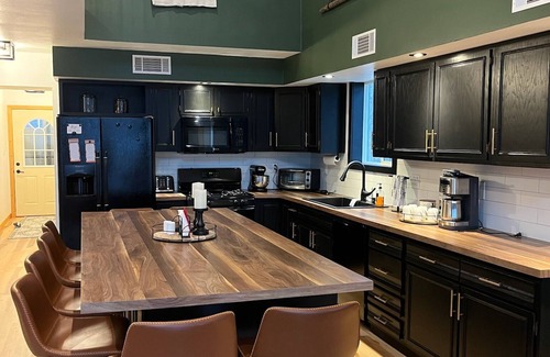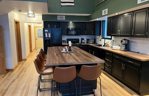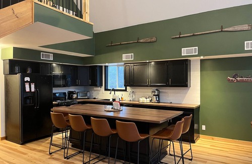 The cabin has a spacious great room, with plenty of space for you to spread out. The fully stocked kitchen is a cook’s dream, with a gas stove and massive island with seating for eight. The dining room offers a large table with an additional eight seats, perfect for big family dinners. The cozy living room has an electric fireplace and 65 inch smart TV.