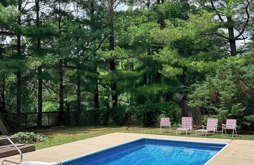 Escape from it all at the A-frame on 22 wooded acres filled with wild life. Slow down and relax inside the calm, peaceful space designed with a modern cabin retreat aesthetic. Put on a vinyl record while you play a board game, do a puzzle, or read a book. Hike the property, explore the cave, or take a swim in the pool. Cook a meal in the beautiful and fully stocked kitchen, unwind with a bath, and drift off to sleep in one of the beautiful bedrooms.