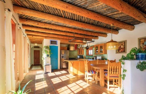 Enjoy the elegance of our traditional Pueblo style adobe home nestled in the trees with stunning mountain views. Bask in this hidden private sanctuary, just a stone's throw from Taos, skiing and the unique village of Arroyo Seco. Artistically decorated and featuring high beamed latilla ceilings, heated saltillo tile floors and a kiva fireplace. As a family of singer songwriters, international cooks and lovers of the outdoors, we hope you enjoy our piano, fully-equipped kitchen and nearby trails.