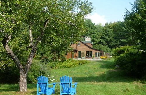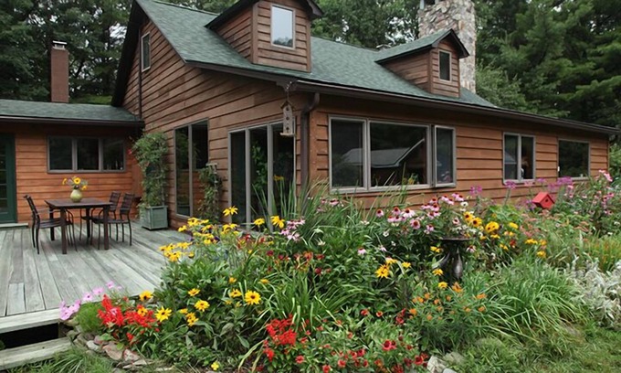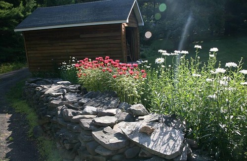 Charming and spacious cedar country house on 5 very private acres with glorious flower gardens, fruit trees, meadows, and woods. Near the house is a pristine and serene reservoir for kayaking, rafting or fishing.