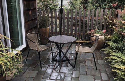 Private: The cottage is a completely self-contained unit detached from our house. The entrance to the cottage is down seven gentle steps (see photo) from our driveway. It includes a kitchenette and a bathroom with a shower stall. Enjoy your own patio for outdoor eating, coffee drinking or reading. You may park off-street in our driveway if you require that.