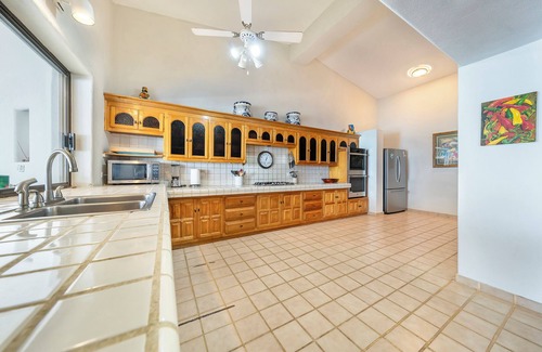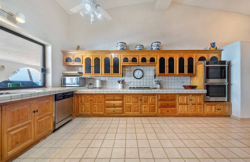 Los Arcos is built on a massive lot with sweeping views of the sea and mountains. There are four large bedrooms: a suite (king-size bed) and two separate other bedrooms (two queen beds and a bunk bed). Each room has a separate full bath and shower. In addition, there is a casita suite detached with three queen beds and a full bath, perfect for the kids or overflow guests.