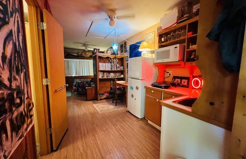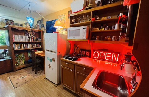 Tucked behind a secluded magical garden, a roofed outdoor patio w/ a water fountain, is nestled in by the surrounding foliage. Inside, a wonder of original art. A cozy, meditative, well lit, zen space