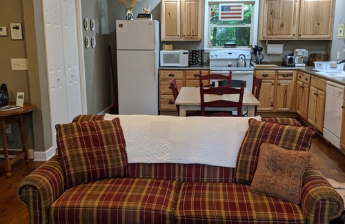 Secluded, yet just 3 minutes from town. Paved road leads to the cabin. Enjoy the peaceful sound of the creek fed by 2 waterfalls. 4 guests only-NO exceptions! Infants/children ARE guests. No pets of any type. NO smoking/vaping inside. Land line phone provided. LL: Bedrooms, bath, laundry & porch. UL: Kitchen, living area, bath & screened porch. We know that you'll fall in love with the area. Clayton has been voted best "Farm to Table" community in GA and has many wineries and waterfalls!