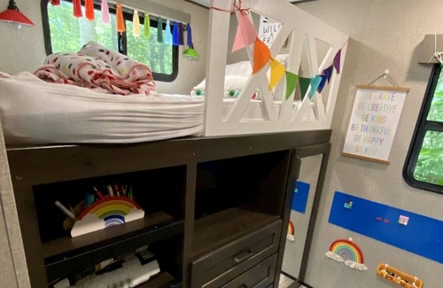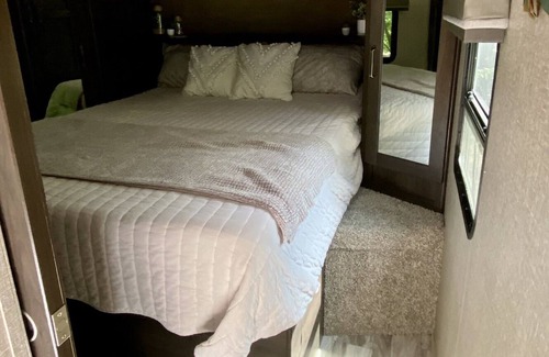 Take it easy at this unique and tranquil getaway. New modern two bedroom camper sits with a fantastic view of swimmable stocked pond for fishing. Peddle boat and a John boat are available for use as well as floats and fishing poles. Theis home away sits on nearly 26 acres of woods with trials and a serene grassy field for picnics and games. Deer, birds, and other wildlife abundant. Enjoy the Winery down the street or a stroll by the shops in Downtown Greenville.
